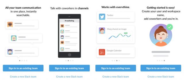 楽しげな色合いやイメージでありながら、アプリの特に重要な要素についてもしっかり伝えています。上の画像をご覧ください。それぞれの画面の下に進捗状況を表すドットがあること、どの画面からでもアカウント作成やログインができることがわかるでしょう。これによって、Slackでの最初の体験から、ユーザーはアプリをコントロールすることができます。理想的なデザインです。