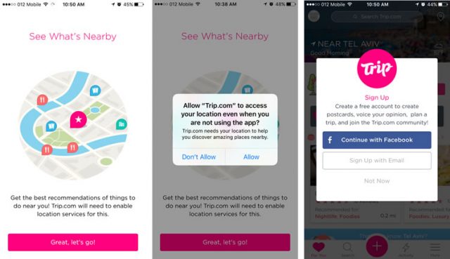 上の3つのスライドを見てください。これは価値指向のオンボーディングのもう1つの事例です。Trip.comはこのスライドで、アプリの利点に関する3つの重要な要素を伝えています。すっきりした見た目に太字で読みやすい字は、導入としてのオンボーディング画面の美しい事例です。