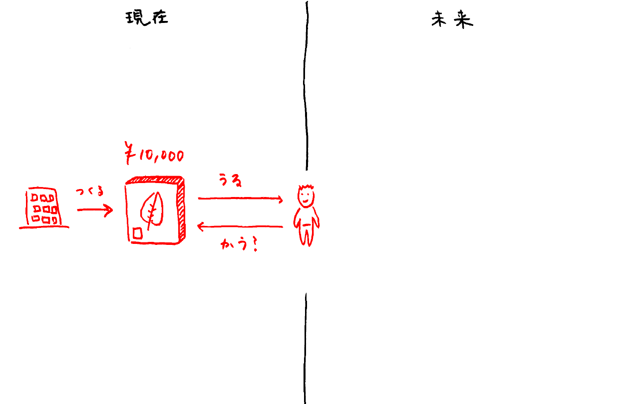 まずはファクト整理です。紙を「現在」と「未来」、半分で分け、発信者、サービスや商品、ユーザーを描き、どういうフローで商品やサービスが提供されているかを示します。現状の課題として、ユーザーは買うのかわからないので、買う矢印にはハテナを付けています。