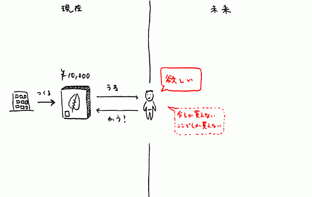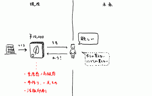 また、下にもう一つ点線の吹き出しで、10,000円の商品を欲しいと思うタイミングとはどういうときかを書きます。私は「今しか買えない」「ここでしか買えない」状況なら、10,000円払う人もいるのではないかと考えました。ここは自分の感覚で大丈夫です。