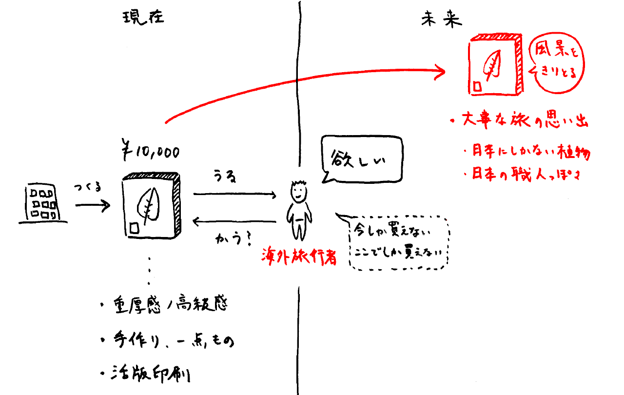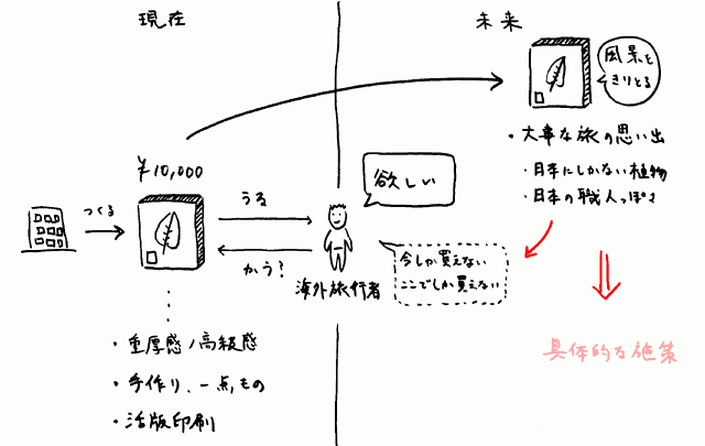 実際の講座動画の方とかぶってしまったのですが、「海外の旅行者が桜など、日本しかない植物の標本を思い出に持ち帰る」というシナリオならば10,000円でも買ってくれるのではないかと考えました。ユーザーが「海外の旅行者」に定まったので、真ん中のユーザーにも明記しました。