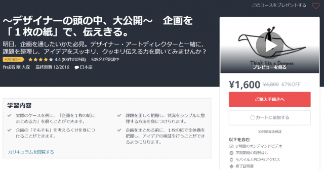 かいつまんでご紹介してきましたが、「〜デザイナーの頭の中、大公開〜 企画を「1枚の紙」で、伝えきる」はオンライン学習プラットフォームUdemyで視聴することができます。