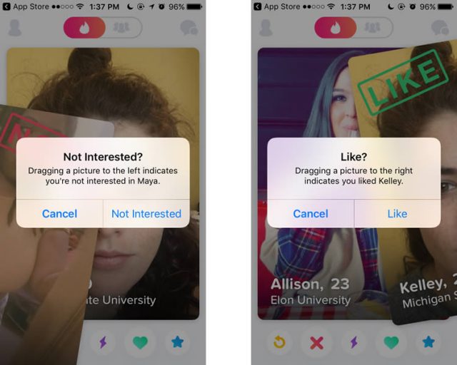 しかし世界的な共通性がある一方で、依然として多くのモバイルアプリでは、ジェスチャーの方法を教える必要があります。これは、そのジェスチャーが一般的かどうかに関わりません。Tinderというアプリは、片手でスワイプをするジェスチャーを文化意識の中に浸透させました。しかしTinderでさえも、初めて訪れたユーザーには簡単なチュートリアルを提示しています。