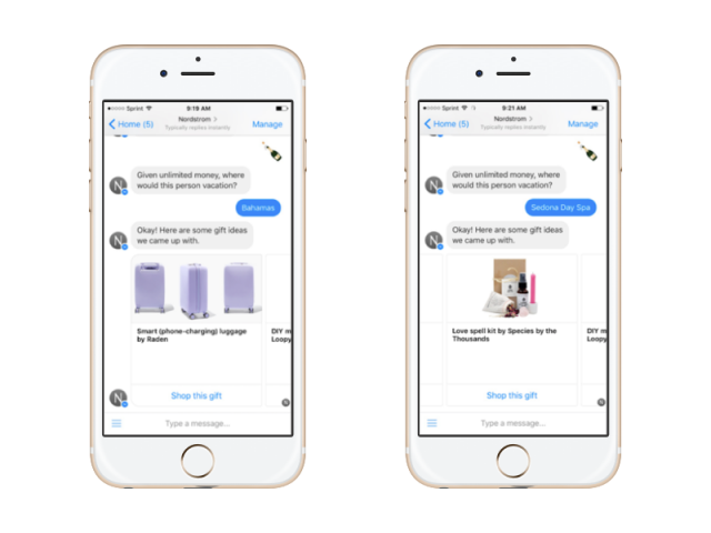 Nordstromについて少し話しましょう。Nordstromがチャットボットによって見出したビジネスチャンスは特筆に値します。人々はますますモバイルのヘビーユーザーになってきているため、モバイルを使用したオンラインショッピングの体験をよりシームレスにすることは、素晴らしい考えです。Nordstromがこのチャンスに気付いたのは2016年で、チャットボットを開始し、休日のショッピング用にギフトのアイデアを見つけやすくしました。これは顧客がメッセンジャーアプリを入手しさえすれば使用することのできる素晴らしいビジネスチャンスであり、素晴らしいカスタマー体験です。