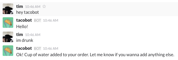 これ自体でも大変画期的なものです。しかし企業は自分自身のボットとチームのSlackアカウントを結びつけたり、ほかのボットを彼らのアカウントにつなげたりすることも可能なのです。Taco BellのTacobotを例に挙げてみましょう。注文を確定している間に、Taco Bellから思いがけないコメントが送られてきています。