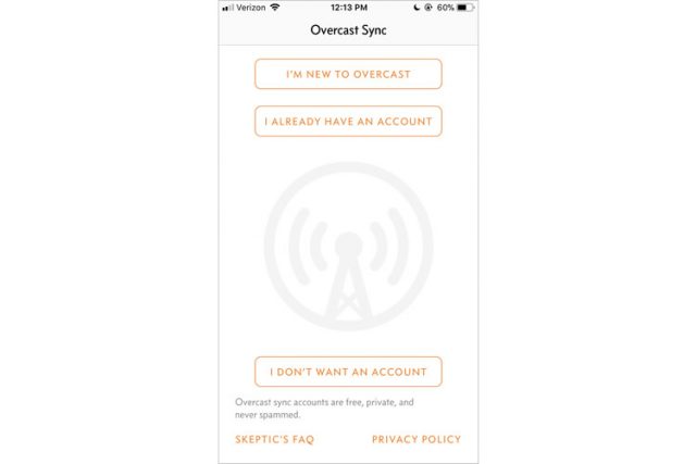 明らかにOvercastはユーザーに登録してほしがっています。「Overcastは初めてです」という選択肢が一番上に配置されていることや、「無料で、プライベートで、スパムのない」アカウントであると表示して、登録をスキップしようとするユーザーを安心させていることからも明らかです。私はアプリのUXについてもっと知見を集めたいので、「初めてです」を選択します。