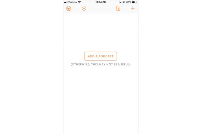 Overcastのホーム画面でも、オンボーディングと同じようにミニマルな外観が続きます。テキストのない4つの選択肢があるナビゲーションバーを使用していて、飾り気のないホーム画面には「Podcastを追加してください」というボタンが1つと、風変わりなコピーがあります。明らかにアプリはボタンに導きたいようなので、それに従って「Podcastを追加してください」をタップします。