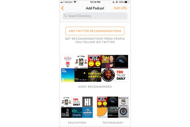 続いて表示された画面を見て、私はアプリに引き込まれました。聞きたいPodcastにアクセスするために、多種多様な内容を提供しています。前回評価したSoundCloudのアプリをPodcatstアプリと見なすことはできますが、そのSoundCloudとは対照的に、Overcastは人気とジャンルの両方からおすすめを表示しています。また、Twitterからのおすすめを受信したり、ディレクトリを検索したり、URLを直接入力したりすることもできます。どのようなプログラムであろうと、Overcastは聞きたいPodcastが見つかるルートを提供してくれるだけでなく、似たものを検索することもできるのです。