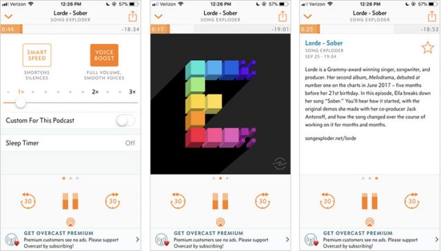 上の3枚のスクリーンショットは、Overcastのオーディオプレイヤーの画面を示しています。中央のものは、聞きたいPodcastを選択したときのデフォルト画面です。多くのプレイヤーと同様に、スクリーンの大部分はカバーアートに充てられています。ここで、Overcastの色を抑えたUIが効果的となっています。Podcastのカバーアートとインターフェイスを並べることで、カバーにポップな印象が生まれています。特にこの画像のSong Exploderのようにカラフルなカバーアートでは、そのような印象が強まるでしょう。