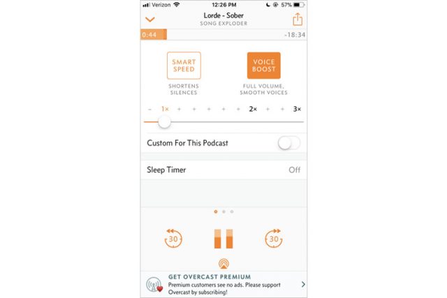 インフォメーション画面について報告することはあまりありません。しかし、設定画面にスワイプすると、嬉しいことにOvercastが提供する異なる機能を見つけました。この機能はAppleのPodcastプレイヤーを完全に圧倒しています。Smart Speed機能は、コピーが示す通り無音の時間を縮めるものです。思わぬ幸運だと感じるPodcastもあれば厄介だと感じるものもあるでしょう。