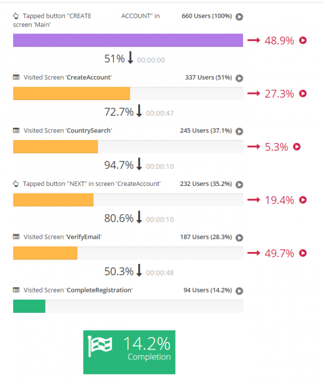 この事例は、多くの公共料金のアプリに共通する、登録のファネルです。ファネルの最後のステップが際立っています。「VerifyEmail(メール認証)」の画面を訪れたあとで、ほぼ半分のユーザーが脱落しているのがわかります。おそらくこの認証画面よりも、もっと良い方法があるはずです。またはこのステップそのものを排除してしまうほうが良いのかもしれません。排除したとしたら、少なくともこのツールのROIを見積もるために、失うユーザー数を簡単に計算できます。