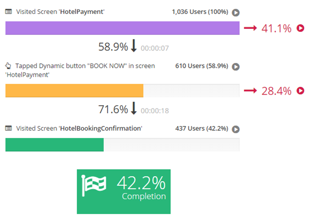 ほとんどのツールには問題があります。ユーザーがどこで脱落するのかは表示しても、なぜ脱落するのかまでは教えてくれないでしょう。これまでのファネルを見返してください。どのステップにも、小さな再生ボタンがあるのがわかると思います。これはAppseeのプラットフォームにあるボタンで、ファネルのそれぞれの段階における、実際のユーザーセッションの動画を見ることができるものです。「HotelPayment(ホテルの料金)」画面で41%のユーザーが脱落している理由を推測する必要はありません。実際に観察できるのです。