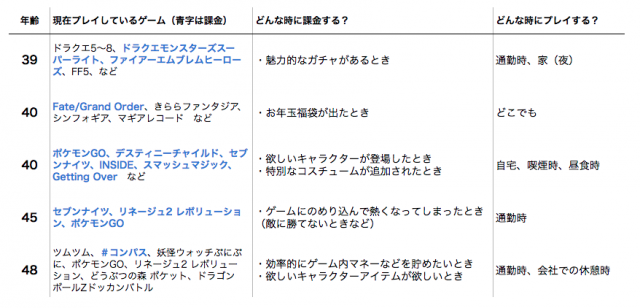 先の調査にもあったように、カジュアルなパズルゲームなどより、割とヘビーなゲームが好んでプレイされており、それらを通勤時にプレイしている、などより具体的な情報が集まります。