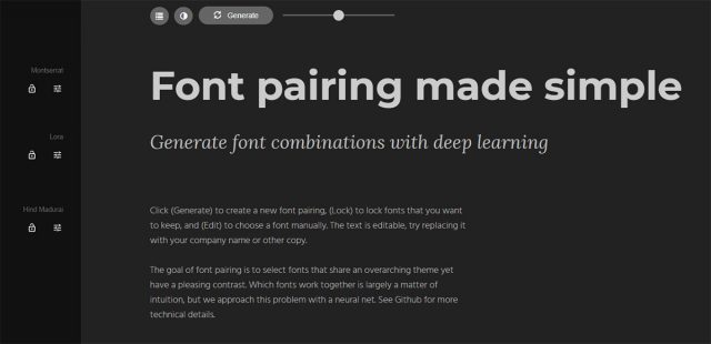 この無料ツールは、Google Webfontsから直接フォントのライブラリ全部を取り込み、1つのページ上でそれらをまとめてキュレートします。そしてサイズや大きさ、ページの行の高さを含めて、どのフォントを試したいかを選択します。