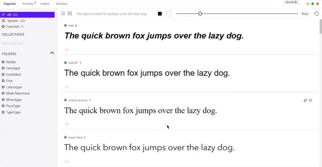 100%無料のフォント管理ツールで、3つの主要なオペレーティングシステムに対応しています。また、コレクションやフォントファウンドリ、カスタムフォルダなどで構成されたシステム上にあるすべてのフォントに対し、ビジュアルGUIを提供します。