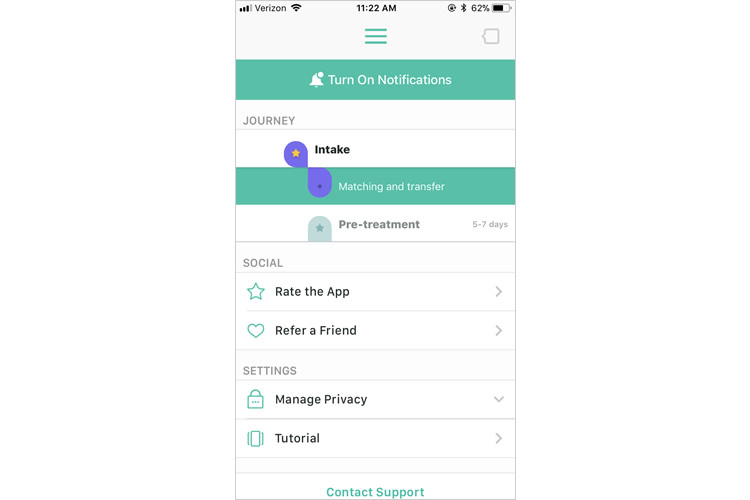 ジャーニーの画像をタップすることで、ユーザーは自分の治療とメンタルヘルスのマイルストーンの進行を見ることができます。このレイアウトは、ホーム画面上にある最小限のアイコンを拡張する一方で、アプリケーション内のいたるところで使用されているティールと白の2トーンのカラースキームに、少しの変化も加えています。