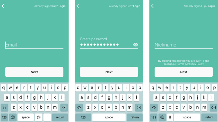 Talkspaceは、ユーザーがスワイプする3つの画面を提供しています。画面の違いは、それぞれのコピーと色だけです。余計かもしれませんが、上の3つのページはApp Storeのリストのスクリーンショットとして適しているでしょう。App Storeではプロモーションの役割を果たし、ユーザーにTalkspaceのダウンロードを促すことができます。しかし今回の場合、私はすでにアプリを手に入れているので、大部分が重複した情報となり、高いインタラクションコストのように思えます。