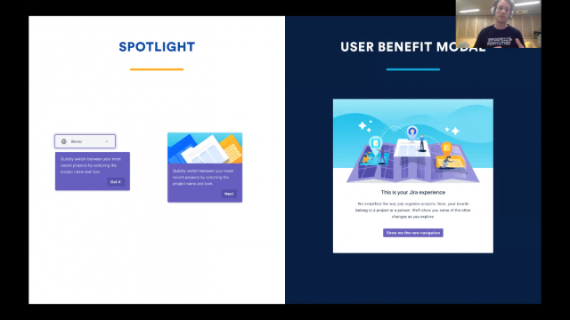 Atlassianではこの手法が2つの新しいコンポーネントの開発に役立てられています。どちらも、過去のイテレーションのフィードバックから生まれたものです。Spotlightは「インターフェイスを案内するためのガイド」であり、User Benefit Modalは「新しい体験が始まる手助けをし、体験のポイントについて教えてくれるものです。」