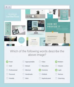 また、私が便利だと感じた、一般的なSD法のバリエーションも存在します。ブランドを表現しているターゲットワードとその対義語を用意して、その中に、デザインを描写するのに使われる可能性のある言葉をいくつか混ぜます。そして、デザインを見せて、ブランドをもっとも表現している言葉を選んでもらうアンケートを実施しましょう。これによって、デザインに間違った反応をされていないかという心配を解消することができます。
