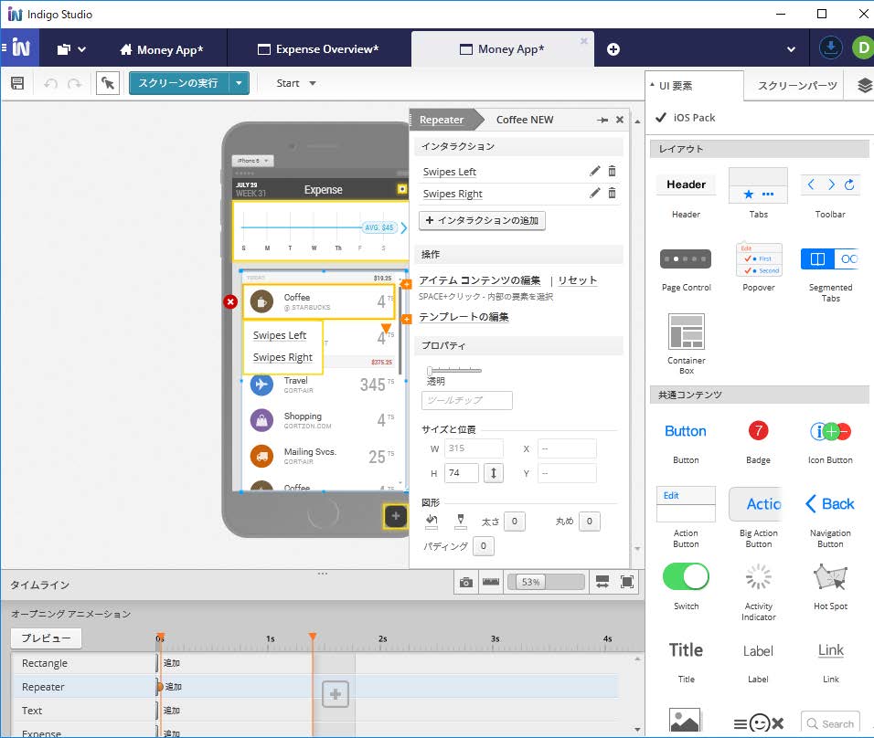 プロトタイピングツールには、遷移するだけのトランジション型と細かい動きをつけられるアニメーション型がありますが、Indigo Studioは両方に対応しています。以前、UX MILKさんのプロトタイピングツールの比較記事でもご紹介いただいたのですが、ほかのプロトタイプツールと比べても機能は豊富だと思います。