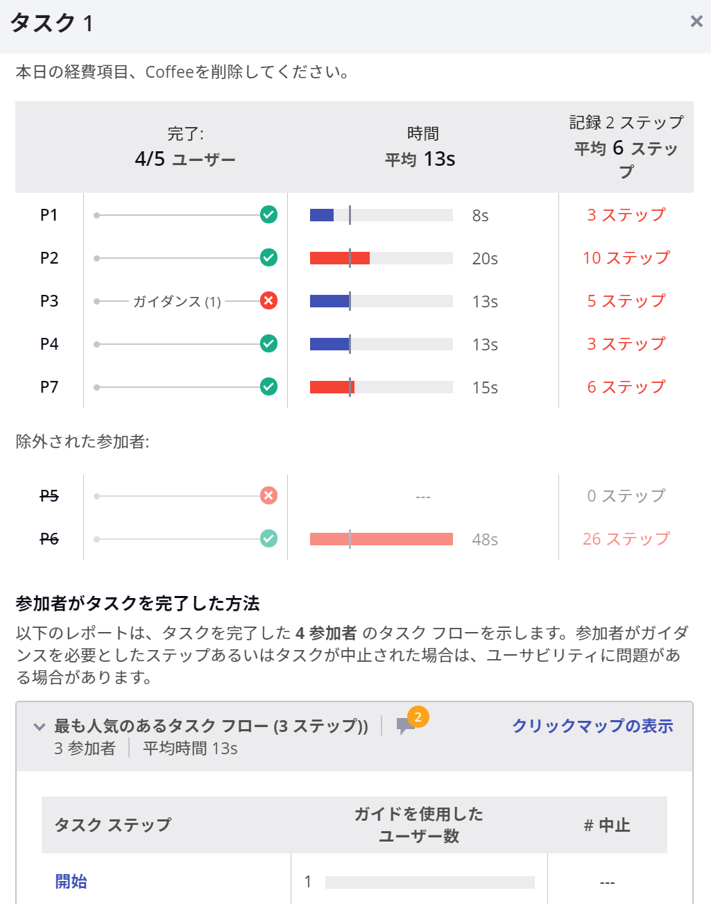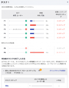 テスト結果はこのように、タスクの完了率や完了までの時間などが自動で表示されます。