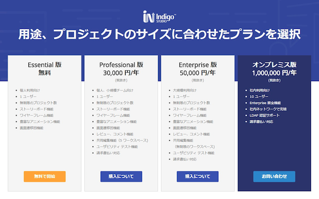 無償と有償の違いは、主にindigodesigned.comを利用できるかです。indigodesigned.comでは、プロトタイプの共有をしたりコメントをしたり、ユーザビリティテストを実施したりできます。エッセンシャル版でも、30日間は無料で利用できるようになっていますので、その部分もお試しいただけます。