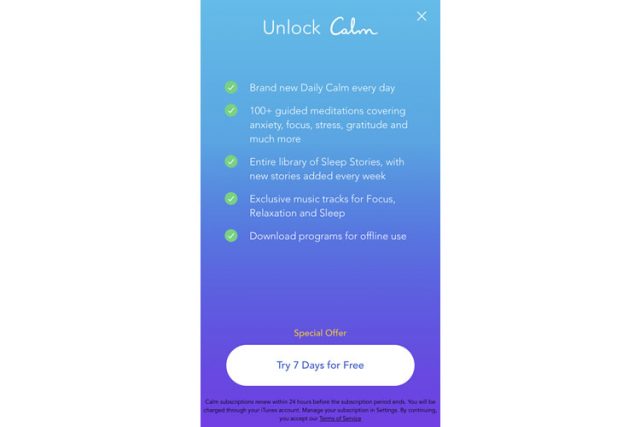 この機能のリストは、私にとってあまり役立ちません。私はまだ、「睡眠について」や「日々のCalm」などの、アプリ内の専門用語を知りません。また、アプリを楽しめるかもまだわかりません。しかし、公平に考えてみましょう。Calmは無料トライアルを提供しています。なので、完全版のアプリ体験から始めたいというある一定のユーザーは、ここでコンバーションするのでしょう。