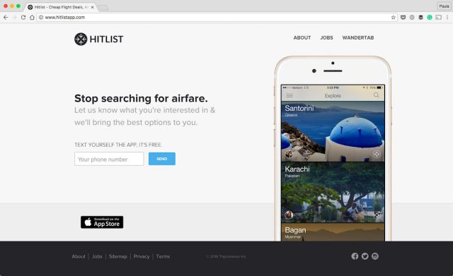旅行用モバイルアプリHitlistのランディングページを見てみましょう。ユーザーが行えるのは、アプリのダウンロードです。ダウンロードには、いくつか方法があります。電話番号を入力してテキストリンクを入手するか、App Storeのボタンをクリックするかです。もちろんほかのリンクをクリックすることもできますが、ページのメインは、ほかのものに邪魔されていません。