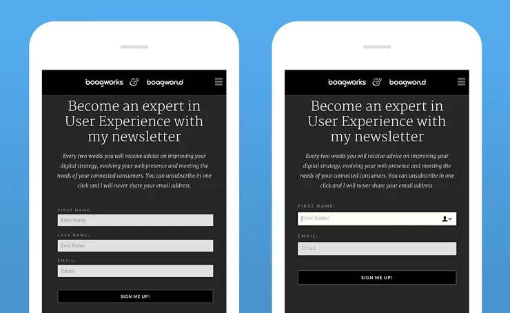 しかし、注意してください。たくさんのスペースを使えるからと言って良い気になってはいけません。スペースがあると、余分な項目を追加したくなるでしょう。この欲望が物事を複雑にします。実は、私もこの罠に陥っていました。この記事を書いているうちに、私は登録フォームでユーザーの姓を尋ねていることに気が付きました。決して姓の情報を使用しないにもかかわらずです。では、なぜ私はそれをユーザーに要求していたのでしょうか? それは、私がMailchimpのフォーマットを盲目的にコピー&ペーストしたためです。ユーザーがその項目を記入する必要があるかどうか、私は立ち止まって考えませんでした。