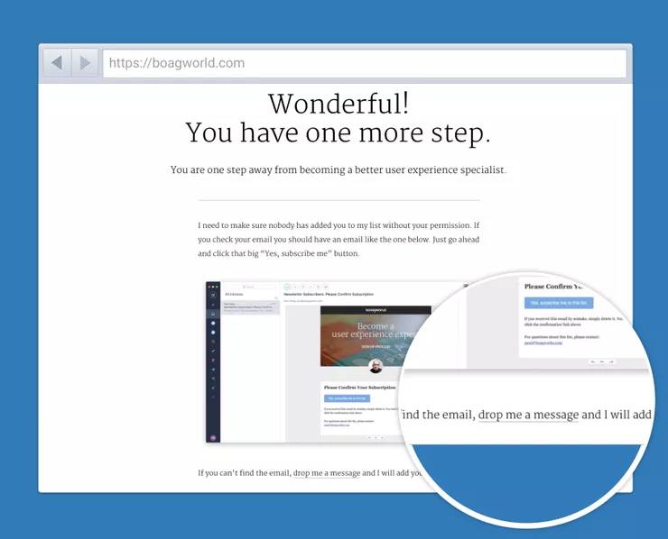 第2に、何らかの理由で確認のメールが届かないかもしれません。そのため、メールを受け取れない場合は、私に連絡するよう登録後のページでうながしています。登録者を失うよりも、手動でメールアドレスを追加する手間をかけるほうが良いでしょう。