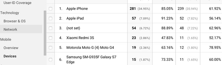 以下に示したスクリーンショットでは、明らかにほとんどの人がAppleのiPhoneかiPadで閲覧しています。このデータを活用すれば、特定のビューポートのサイズを優先することが正しいと確信できるでしょう。