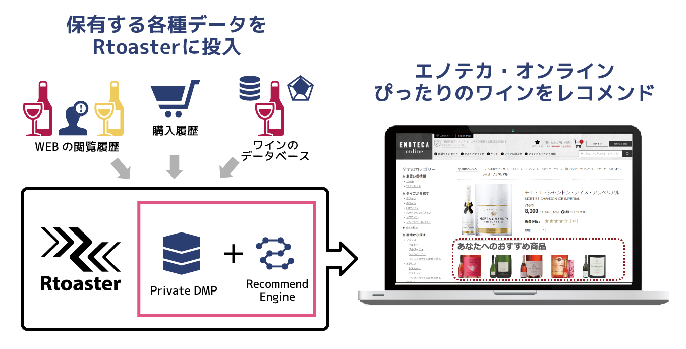 エノテカ様は実店舗もあるので、お店でソムリエが薦めてくれるくらいの精度でサイト上でもレコメンドしたいという要望がありました。そのために、ユーザーの閲覧履歴だけではなくてワインの産地や品質、価格帯、ぶどうの種類、醸造方法などワインに関するあらゆるデータをRtoasterに入れて、ユーザーごとにおすすめの商品を出しています。