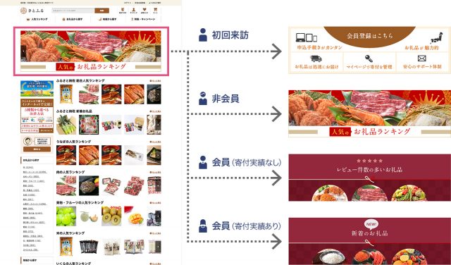 訪問者を「初回訪問・再訪」、「会員・非会員」のセグメントに分けて、初回訪問者にはサイトの魅力を訴求しながらバナーで会員登録を促し、一度訪問したけど会員になっていない人に対しては、ランキングを表示することでよりサイトを知ってもらって会員登録を促しています。さらに、会員になってもらったけれども寄付実績がないユーザーに対しては、レビューの多い商品をバナーで表示しています。