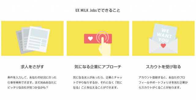 UX MILK Jobsは転職サービスとしては非常にシンプルなもので、「求人を探せる」「気になる企業にアプローチできる」「企業からスカウトを受け取れる」というのが主な機能です。