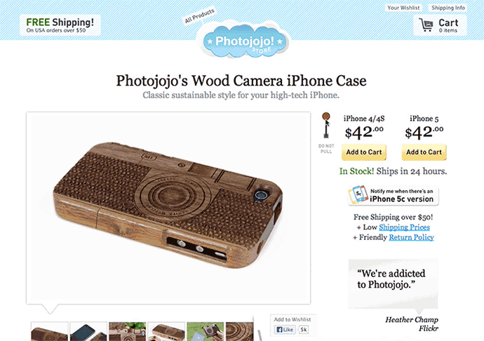 例:カメラアクセサリーのECサイトであるPhotojojoは、記憶に残る楽しいショッピングエクスペリエンスを作り上げています。Webサイトは、ユーザーが自分で選択できるような遊び心溢れたサプライズでいっぱいです。たとえば、「引っ張らないで」と名付けられたレバーがあります。好奇心をそそられそのレバーを引っ張ると、アニメーションの手が画面上部から降りてきて、製品詳細へ導いてくれるのです。