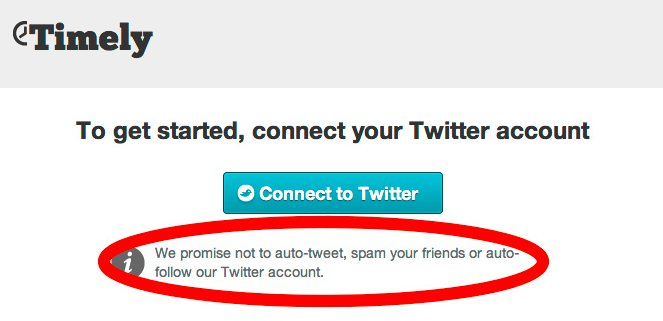 例:Twitter連携を求める際に、「自動的にツイートしません」と表示することは良いマーケティング担当者にとっては当然のことかもしれませんが、ユーザーにとってはそうではありません。Timelyのマイクロコピーは、短い文章でユーザーの心配事を解消してくれます。