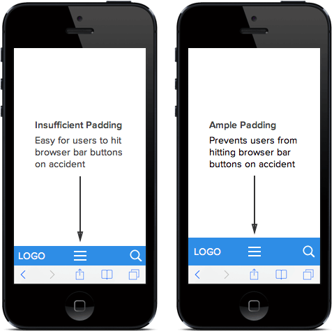 画面下のナビゲーションバーについても同じことが言えます。分離されているのが視覚的にわかりやすいよう、メニューアイコンとブラウザバーの間に余白を取りましょう。これによって押し間違いを防ぐことができます。