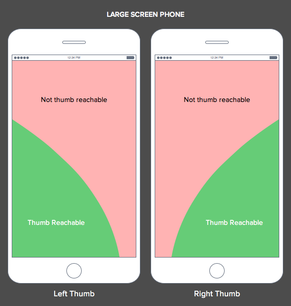 しかし、ユーザーがスマートフォンを握っているとき、親指は限られた範囲でしか動けません。画面に親指が届かない領域があるのです。この領域は、スマートフォンの画面のサイズと、左右どちらの手で持つのかによって変わるでしょう。