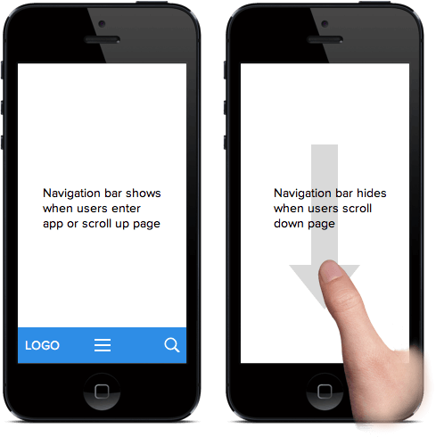 この問題は2つとも、スクロールアップバーを使うことで解決できます。スクロールアップバーとは、ユーザーがスクロールダウンするときにはナビゲーションバーが隠れるものです。バーは、ユーザーがスクロールアップするときにだけ現れます。この技術は、モバイルアプリやブラウザですでに広く取り入れられています。