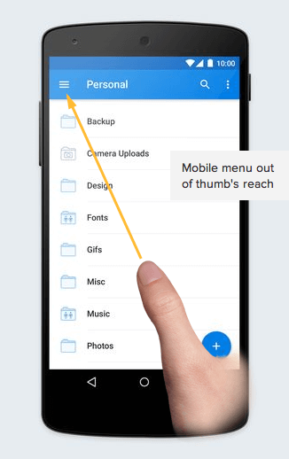 画面下のメニューは、見慣れた画面上のメニューと比べると、異例に見えるかもしれません。しかし、画面上のメニューは、モバイルデバイスを操作するユーザーの親指の動きを無視しています。