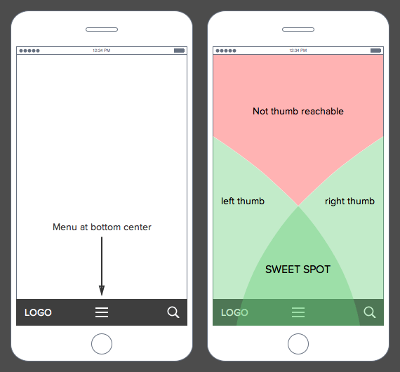 メニューを設置すべき理想の場所は、スマートフォンの下端の中心です。この場所は、スマートフォンの大小にかかわらず、どちらの指でも一番届きやすい領域です。