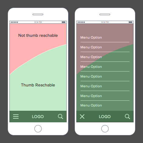 親指は、モバイルデバイスを操作する際にもっとも使用される指です。よってメニューフォームは、親指の動きに合わせる必要があります。この原理をないがしろにすると、使いづらいメニューをデザインすることになるでしょう。使いづらいメニューは、ユーザーのエンゲージメントと満足度を低下させます。