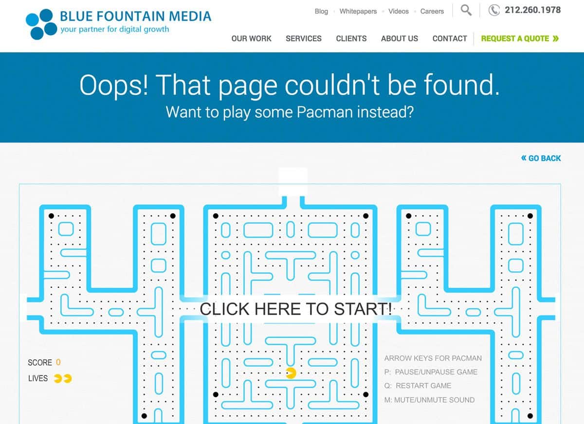 他の例を見てみましょう。ブルー・ファウンテン・メディアでは、ネガティブな感情をポジティブなものに変えることができる可能性を示しています。404エラーページでは「%&/%#∞÷!」のようなものが典型的です。これはただのエラーであるためユーザーをイライラさせます。しかし彼らは、以下のような創造的な404ページによってエラーページをWebサイト上の素晴らしい経験に変えました。