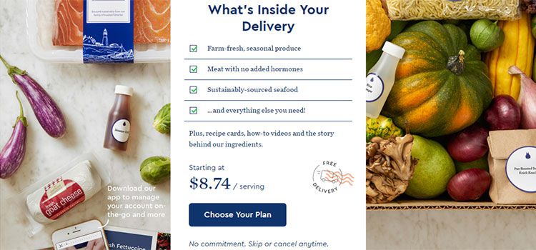 食材宅配サービス会社Blue Apronのサイトを見てみると、トップページはまさにCTAのオンパレードです。入手可能なものと価格が、読みやすいフォーマットで伝えられている点が、私はとても気に入っています。