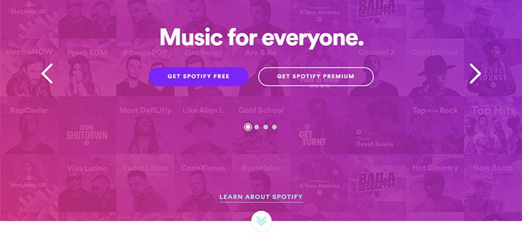 ひとつ上のBlue Apron同様、音楽ストリーミングサービスSpotifyも会社のセールスポイントをCTAの背景にしています。一方、それ以外ではシンプルなアプローチをとっています。