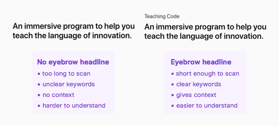 上記の図はメインの長い見出しにアイブロウヘッドラインがあるものと、ないものを示しています。この見出しには、本文の概要を説明するキーワードが不足しています。そのため、アイブロウヘッドラインありの場合と比較すると、なしの方が本文の意味を理解することがより難しくなります。またアイブロウヘッドラインがあると、ユーザーは長い見出しを読む気にもなります。
