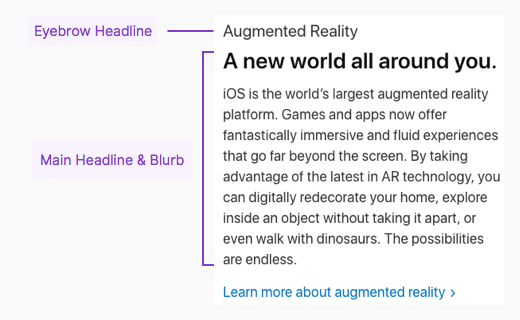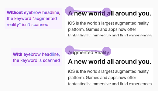 下記の図を見てください。上の例では、キーワード”Augmented Reality”が見出しに書かれていません。そのためユーザーは見出しを読んだだけでは、なにについての文章かわからないのです。図の下の例のようにアイブロウヘッドラインを使えば、ユーザーはすぐにキーワードがわかり本文の概要を知ることができます。