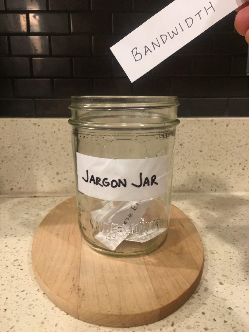 簡単なヒント:「専門用語ビン(jargon jar)」と呼ばれるシンプルな方法が、専門用語問題を解決する助けになるかもしれません。自分の発言した言葉が一緒に働いている人々に伝わっていないと気付くたびに、使った言葉を書き留めてビンに入れましょう。そして定期的にビンの中の言葉を分析してみてください。