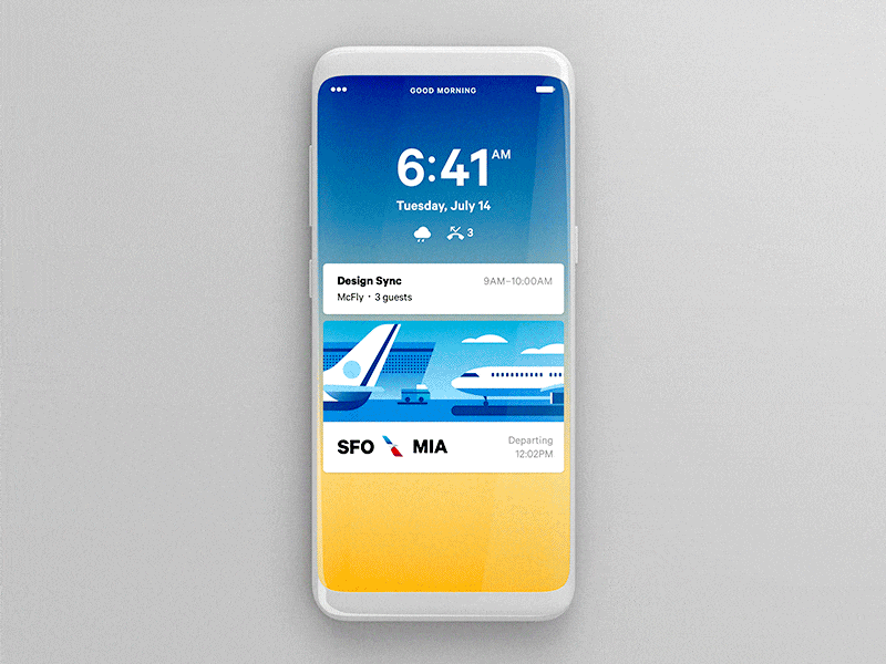 Alex Sol氏によって作られたカレンダーのコンセプトは、プッシュ通知と毎日の予定を融合させた代表的な例です。ユーザーは1日の予定を開き、その詳細を見ることができます。このコンセプトで特に気に入っているのは、ユーザーが利用する航空機情報を参照する方法です。必要な情報がひと目でわかると、ユーザーは通知をより快適に感じます。