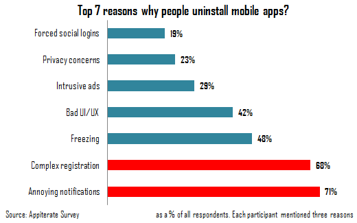 不愉快な通知がモバイルアプリをアンインストールする1番の理由です(71%の調査回答によると)。